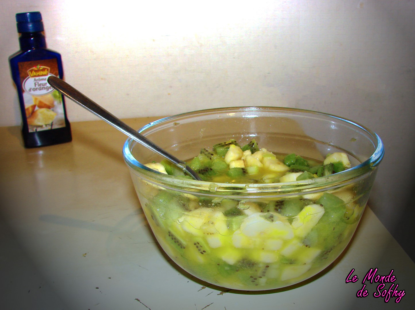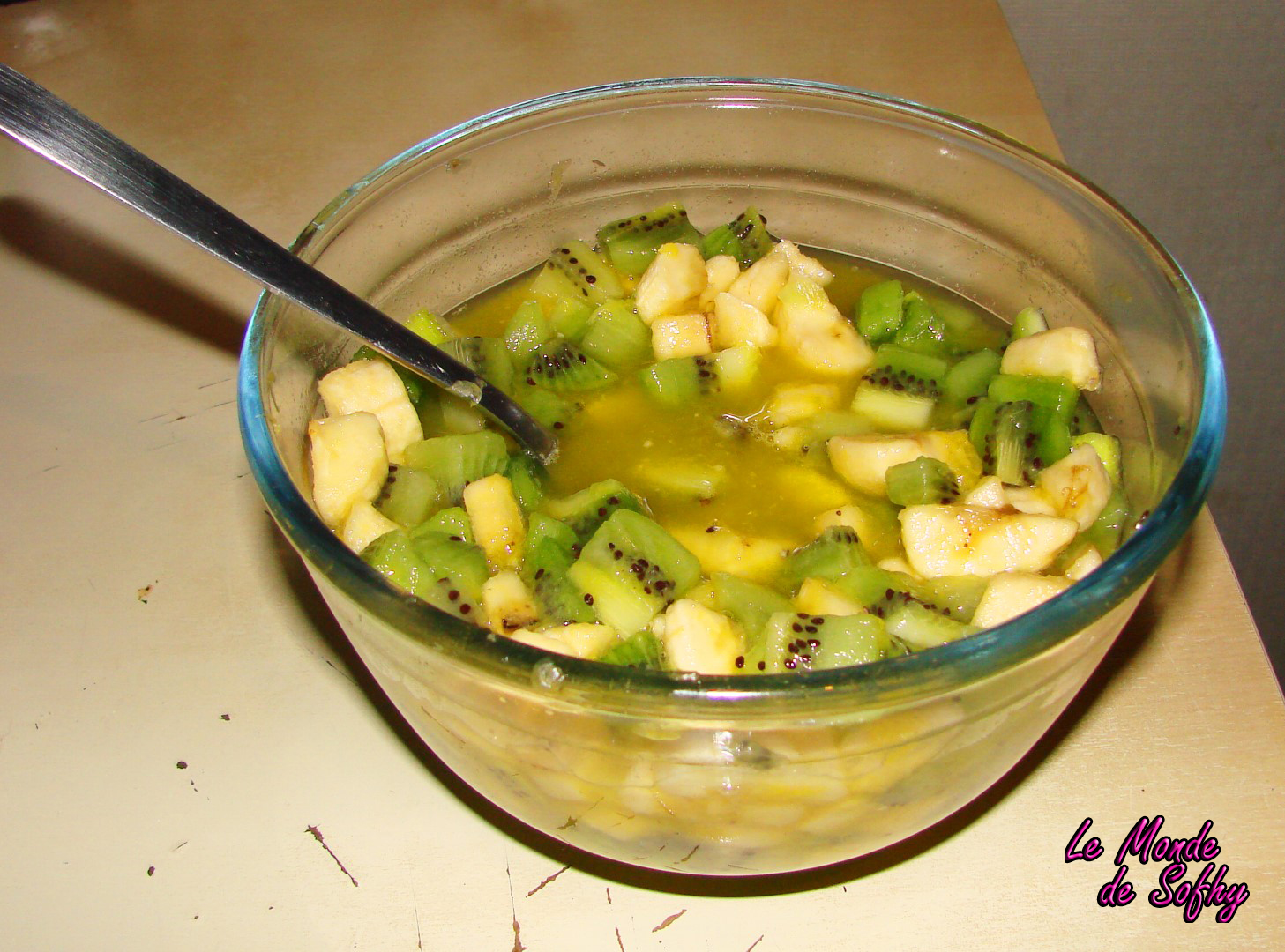 Peler les kiwis et les couper en dés. Faire de même avec les bananes. Presser les 2 oranges ainsi que le citron et verser sur les fruits coupés.