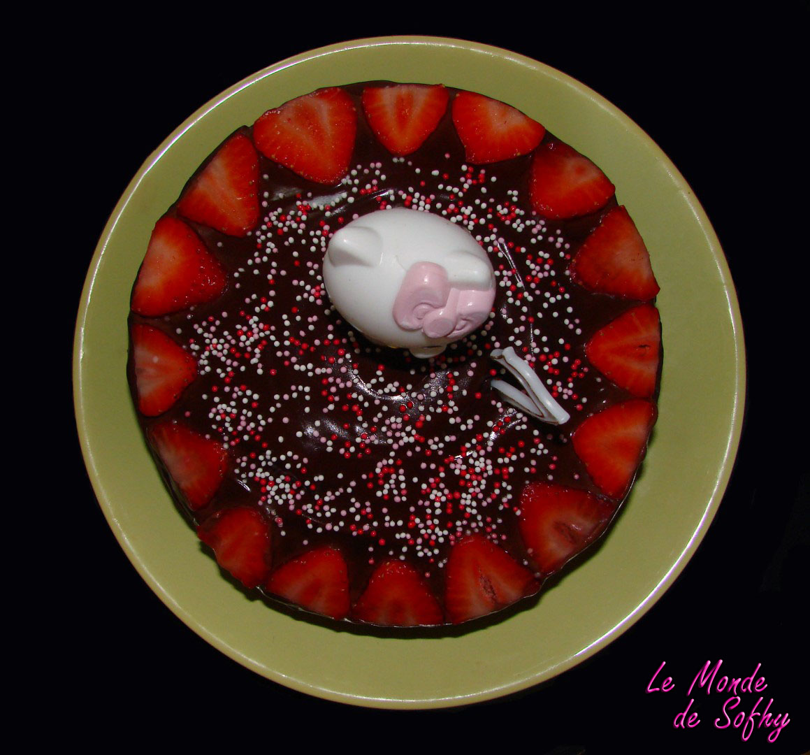 Coupez le gâteau en 2. Sur la base du gâteau, étalez la moitié du glaçage au chocolat. Disposez des lamelles de fraise (gardez en un peu pour la déco). Recouvrez délicatement avec la seconde moitié du gâteau. Recouvrez avec le reste de glaçage. Décorer avec les fraises restantes.