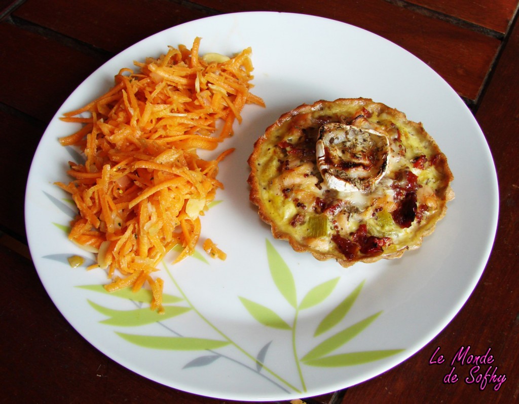 Etalez la pâte à tarte, et foncez les petits moules. Etalez 1 cuillère à café de moutarde à l’ancienne sur chaque fond de tarte. Répartissez le mélange poireaux / oignons, les tomates séchées et le saumon fumé.