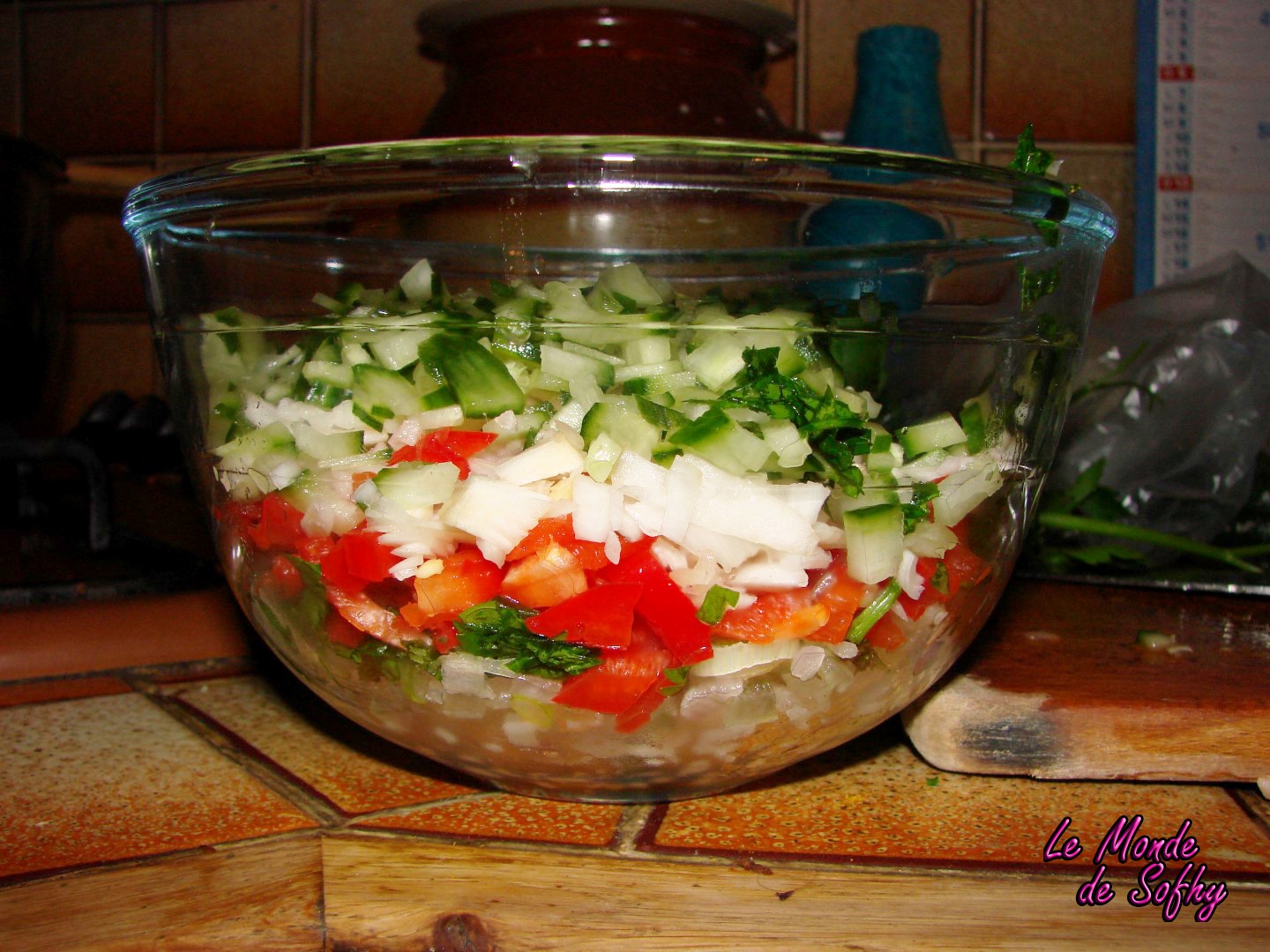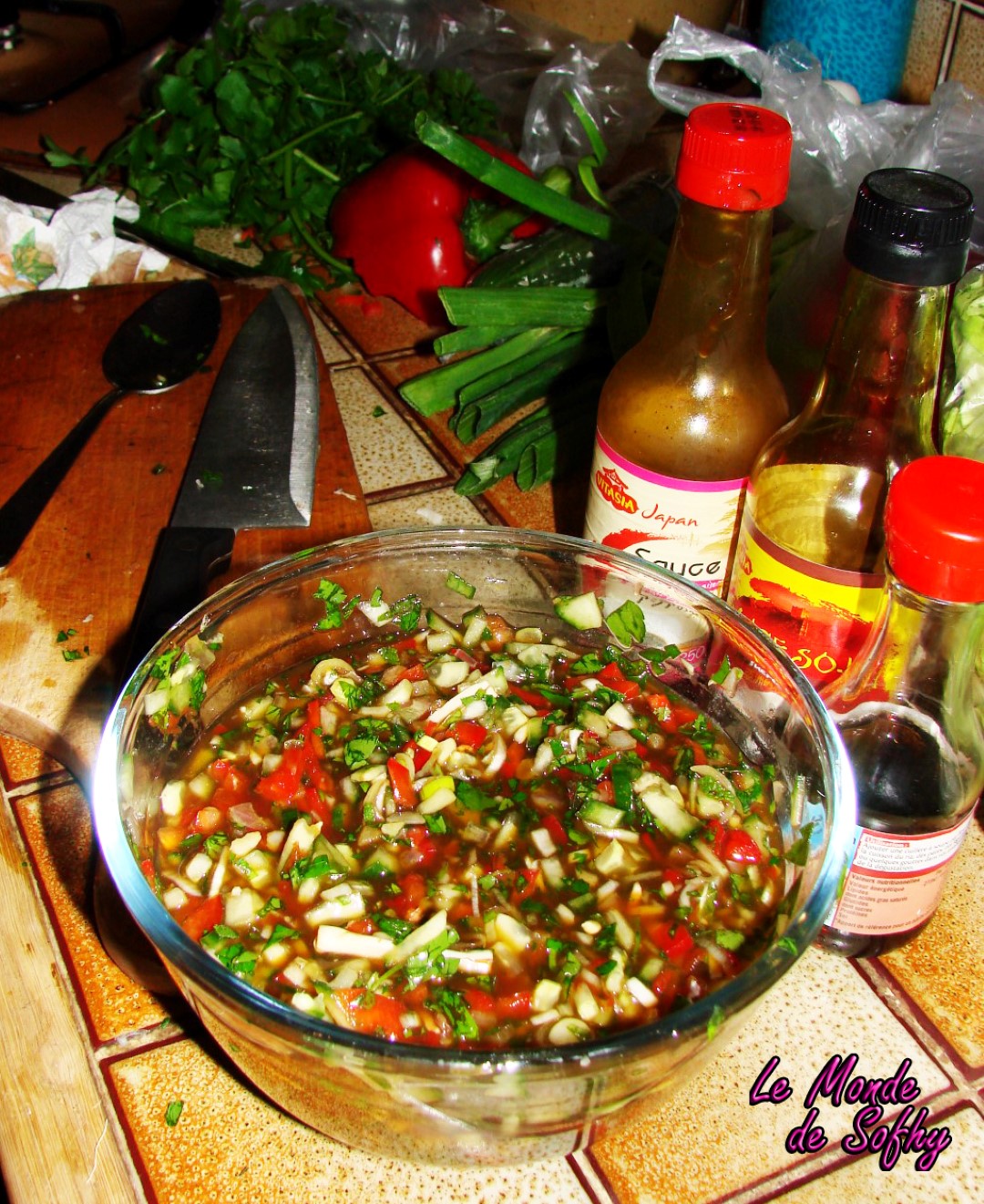 Préparer une marinade avec 5 cs de sauce tériyaki, 2 cs de sauce soja sucrée, 1 cs de nuoc mam, 10 cl de vinaigre de riz, le jus des 3 citrons verts, 2 cs de sucre de canne. Ajouter le concombre coupé en dés, le poivron coupé en dés, l’oignon haché, la menthe ciselée, le persil plat haché, la citronnelle émincée, l’ail et l’échalotte. Réserver.